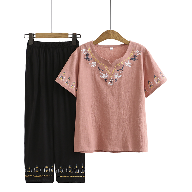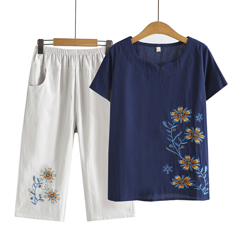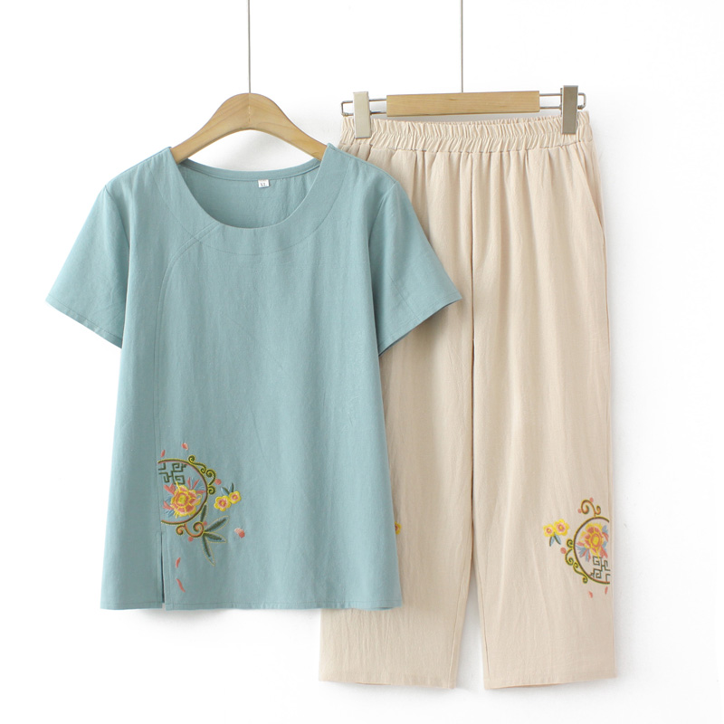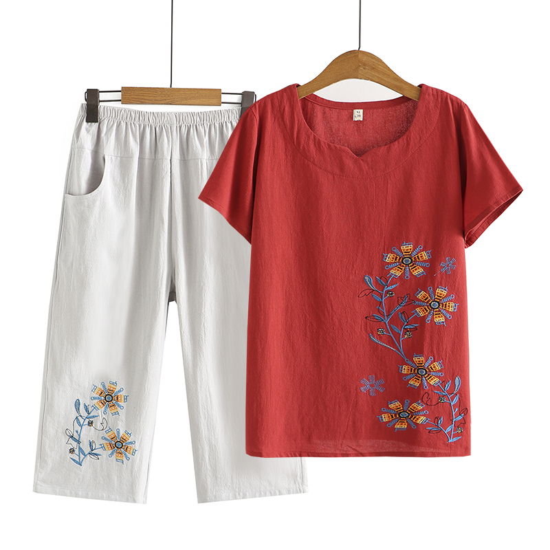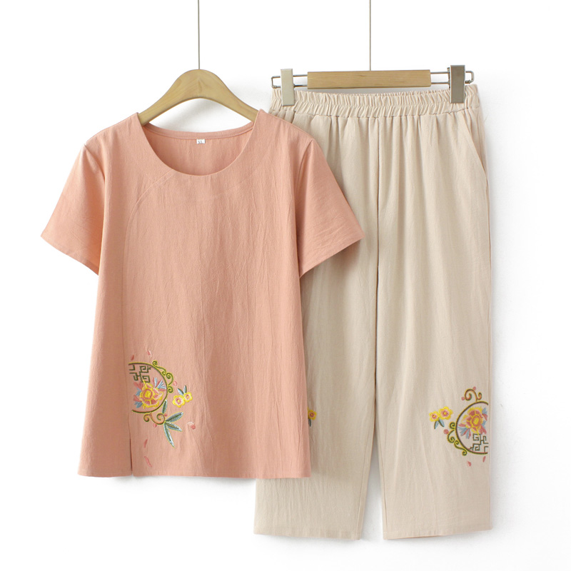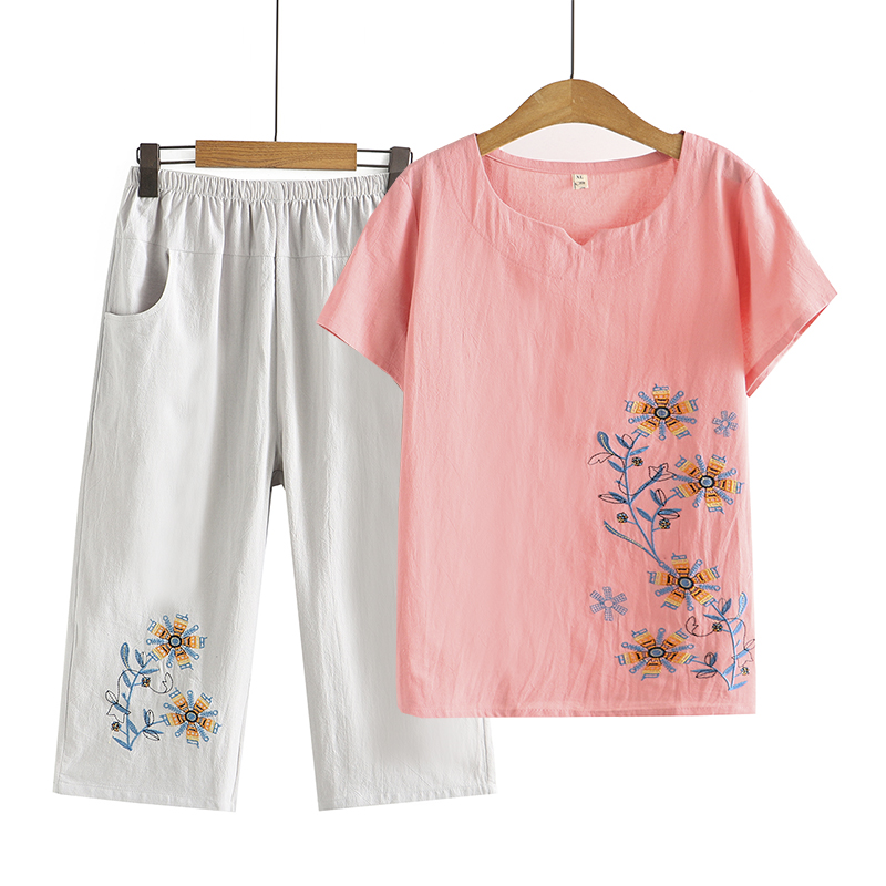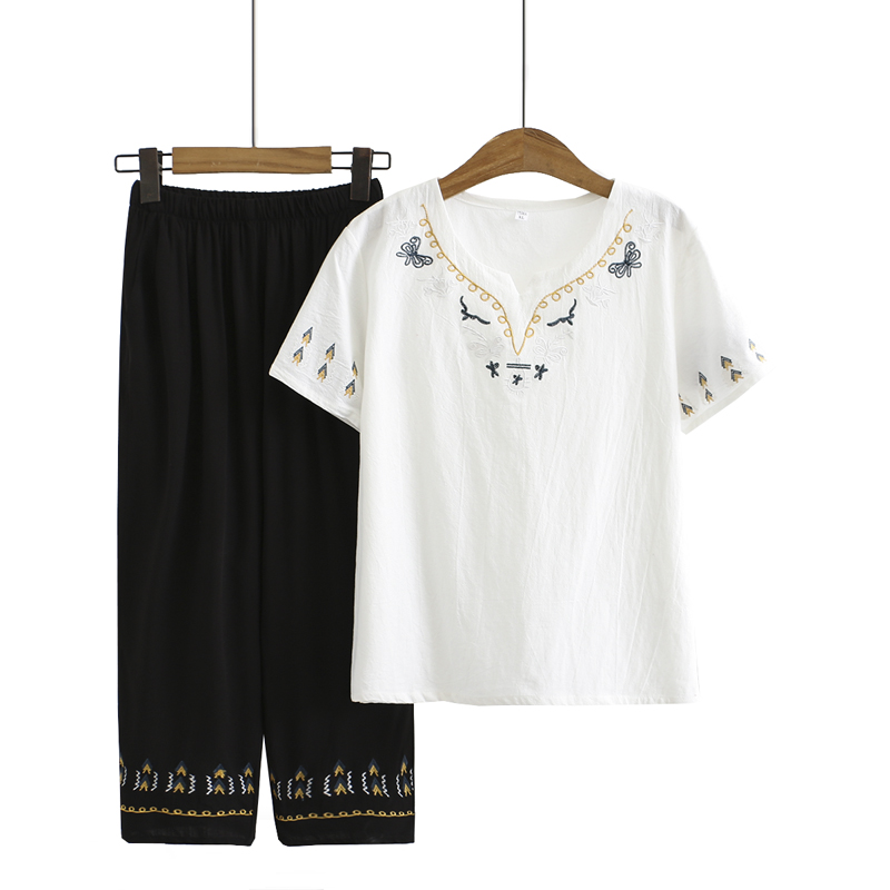 夏季妈妈短袖两件套装中年女装大码棉绣花时尚T恤中老年洋气上衣