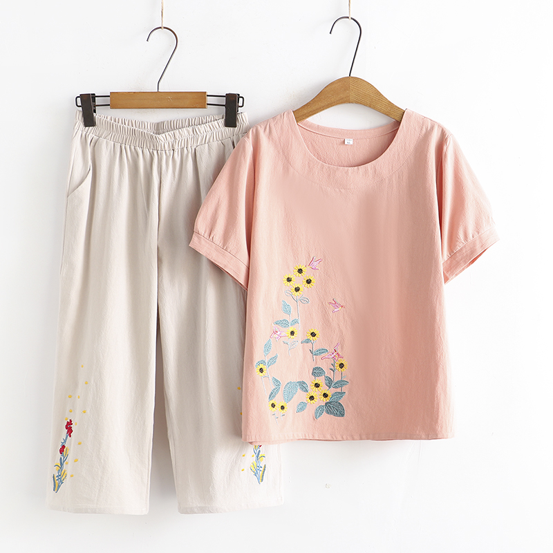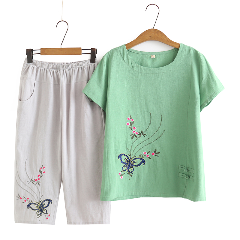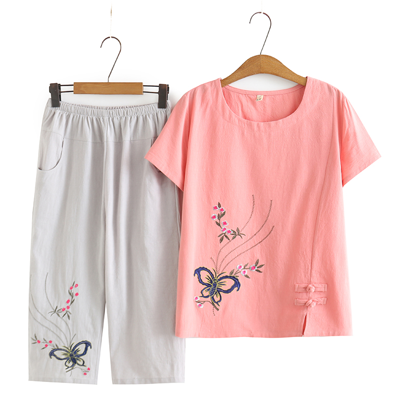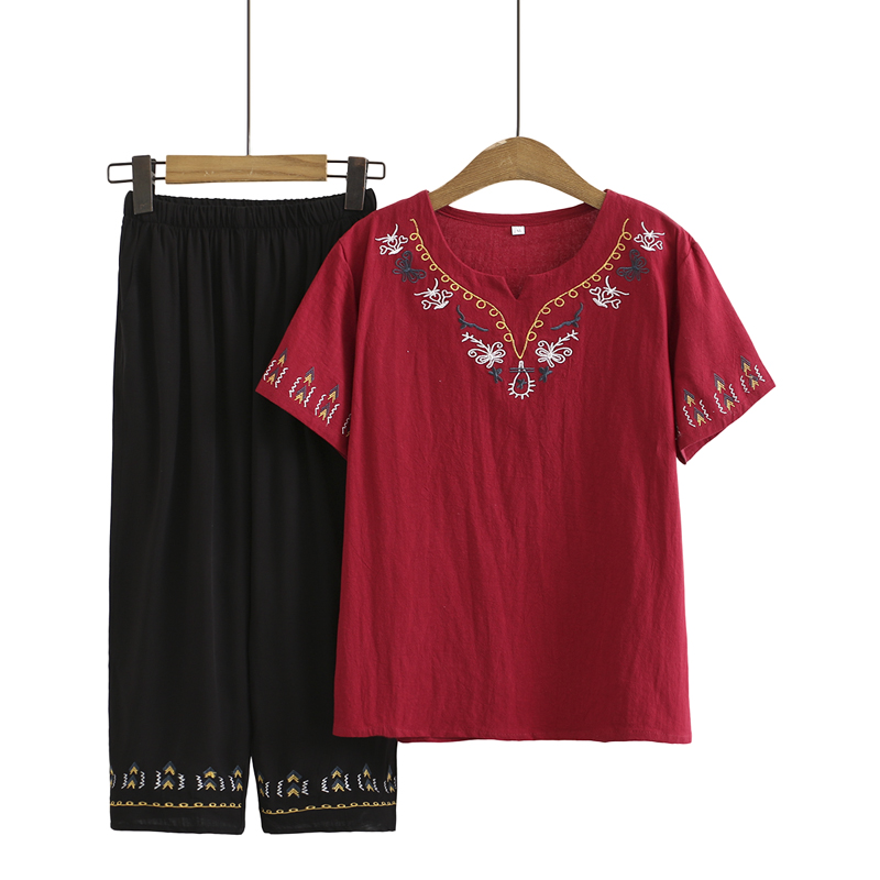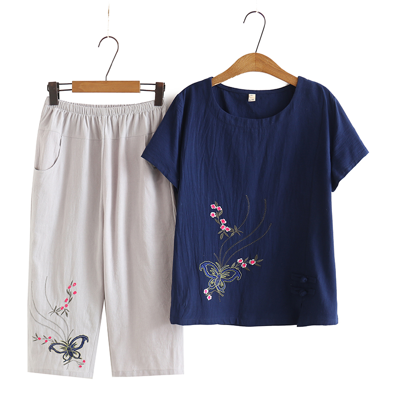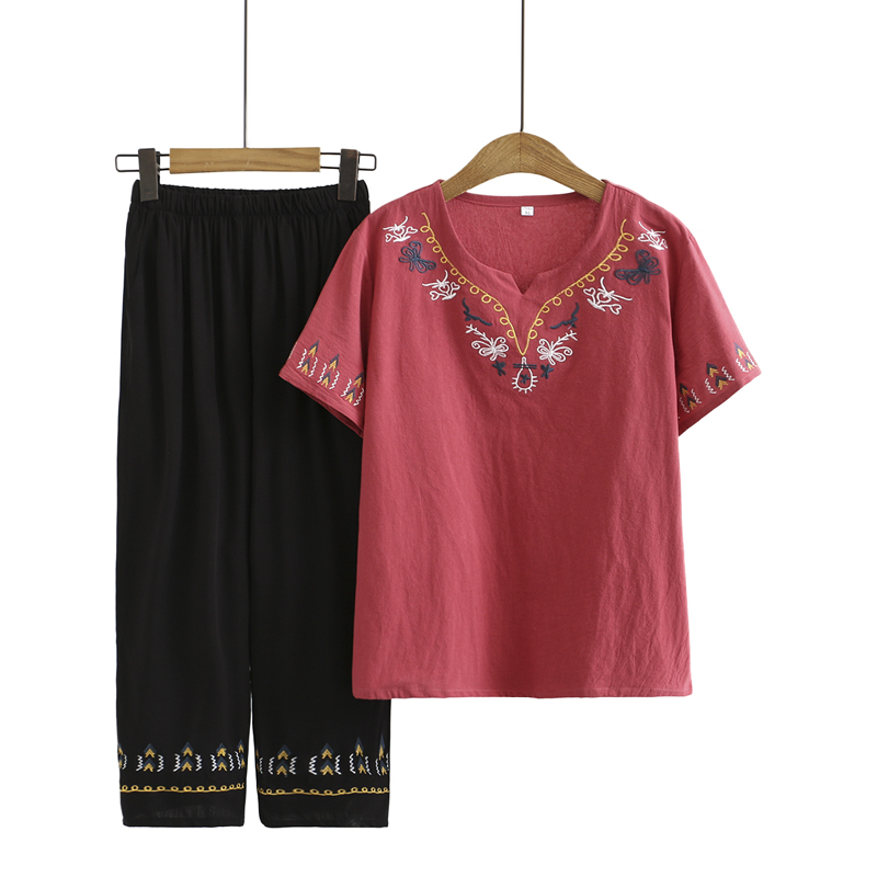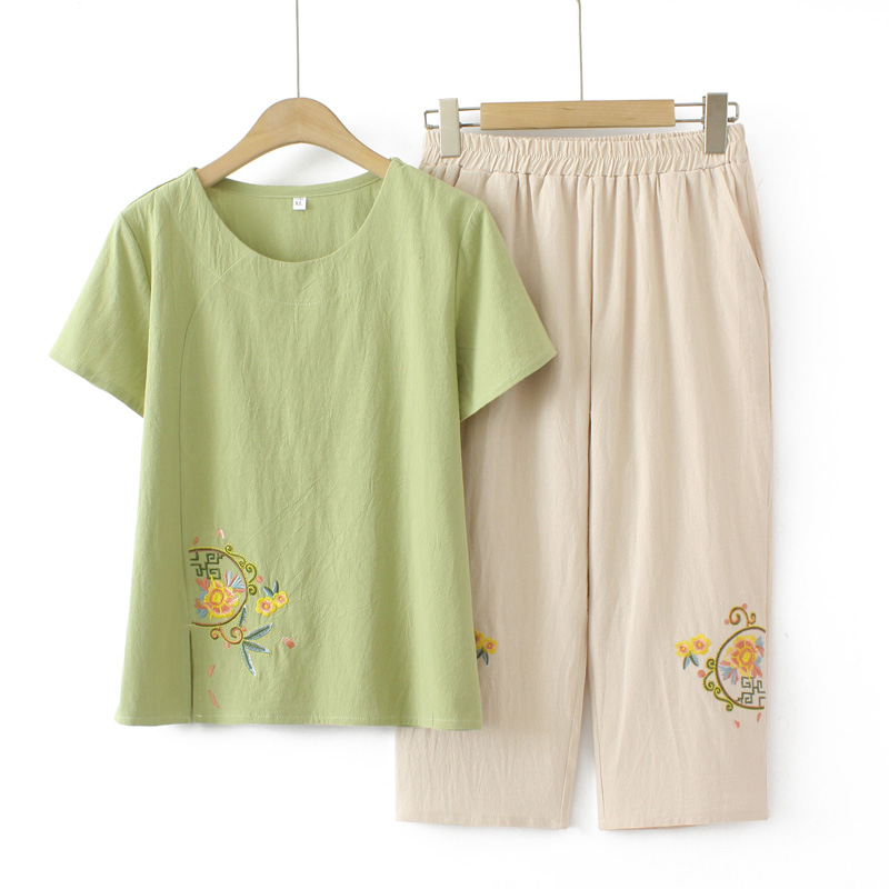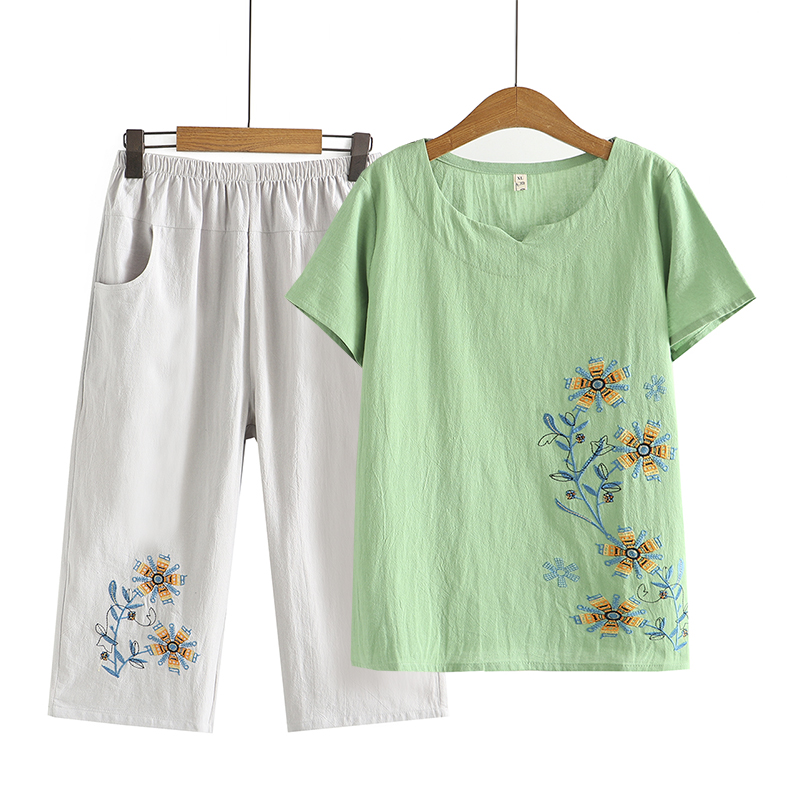 夏季妈妈短袖两件套装中年女装大码棉绣花时尚T恤中老年洋气上衣