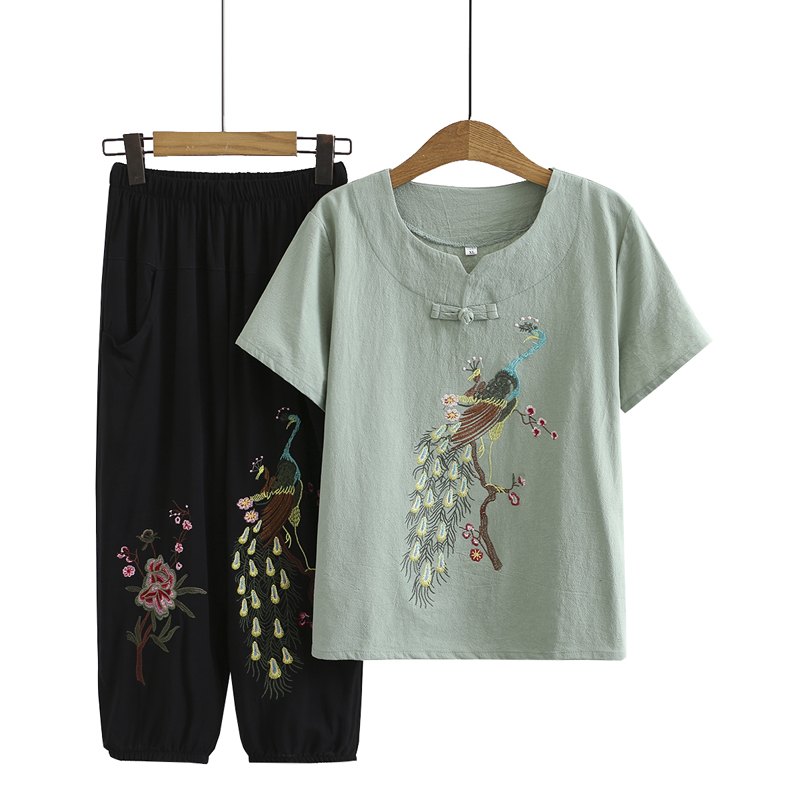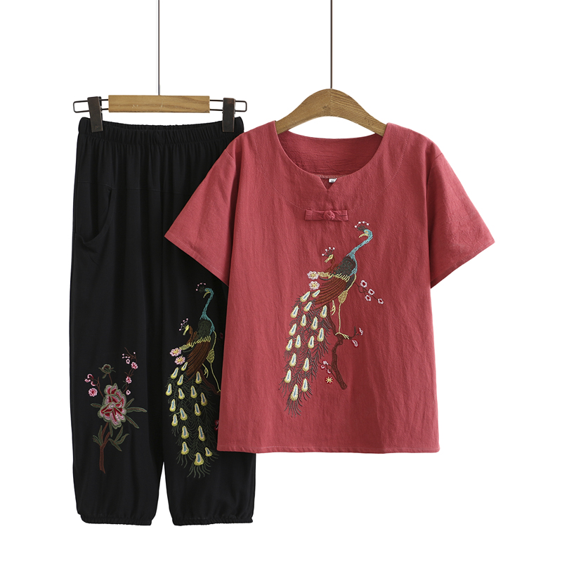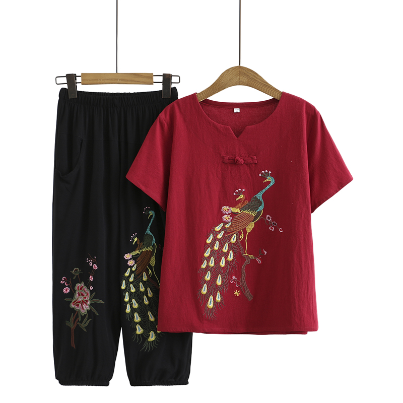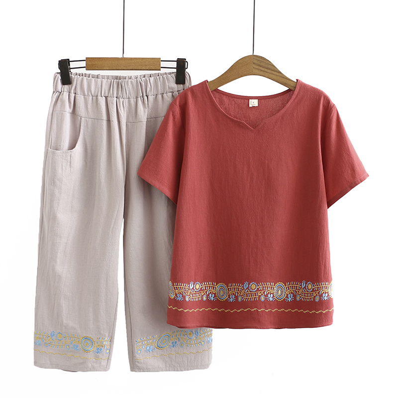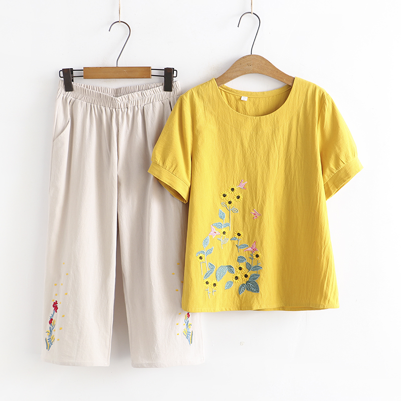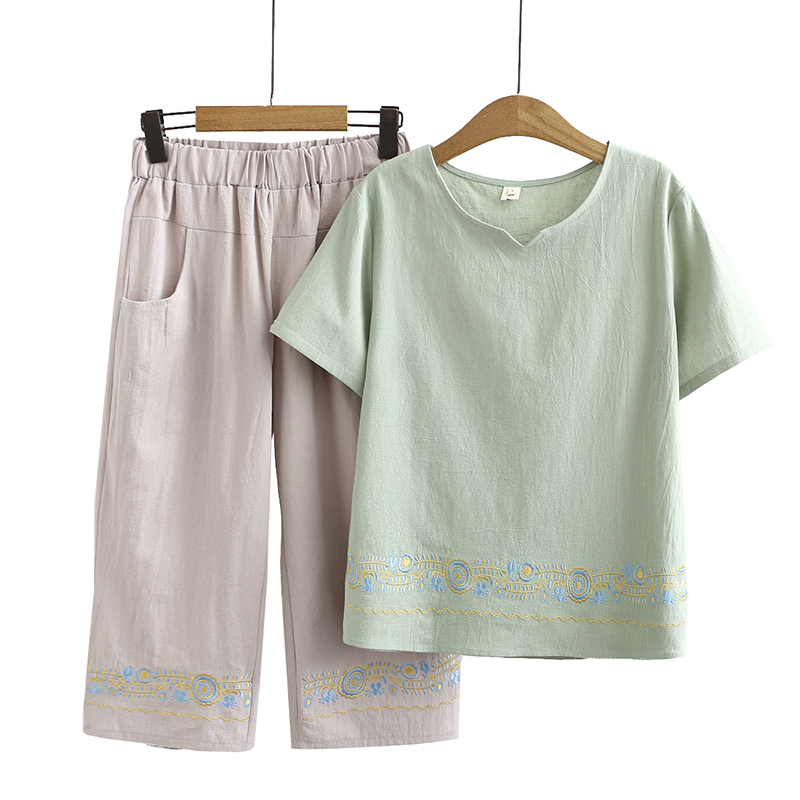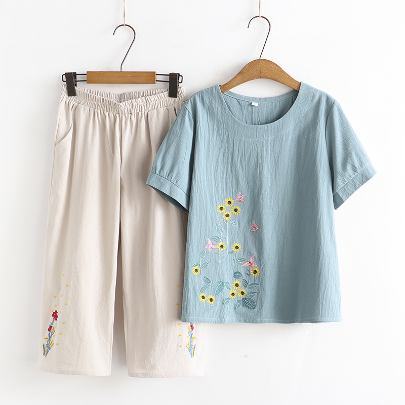 夏季妈妈短袖两件套装中年女装大码棉绣花时尚T恤中老年洋气上衣