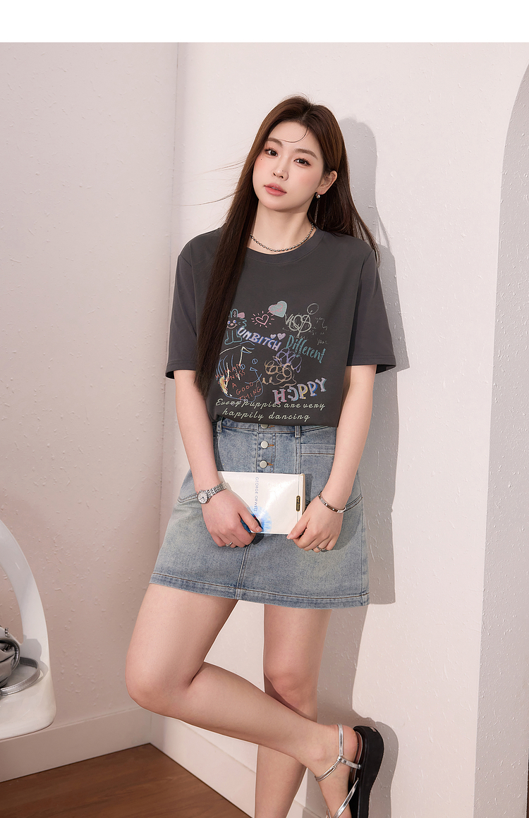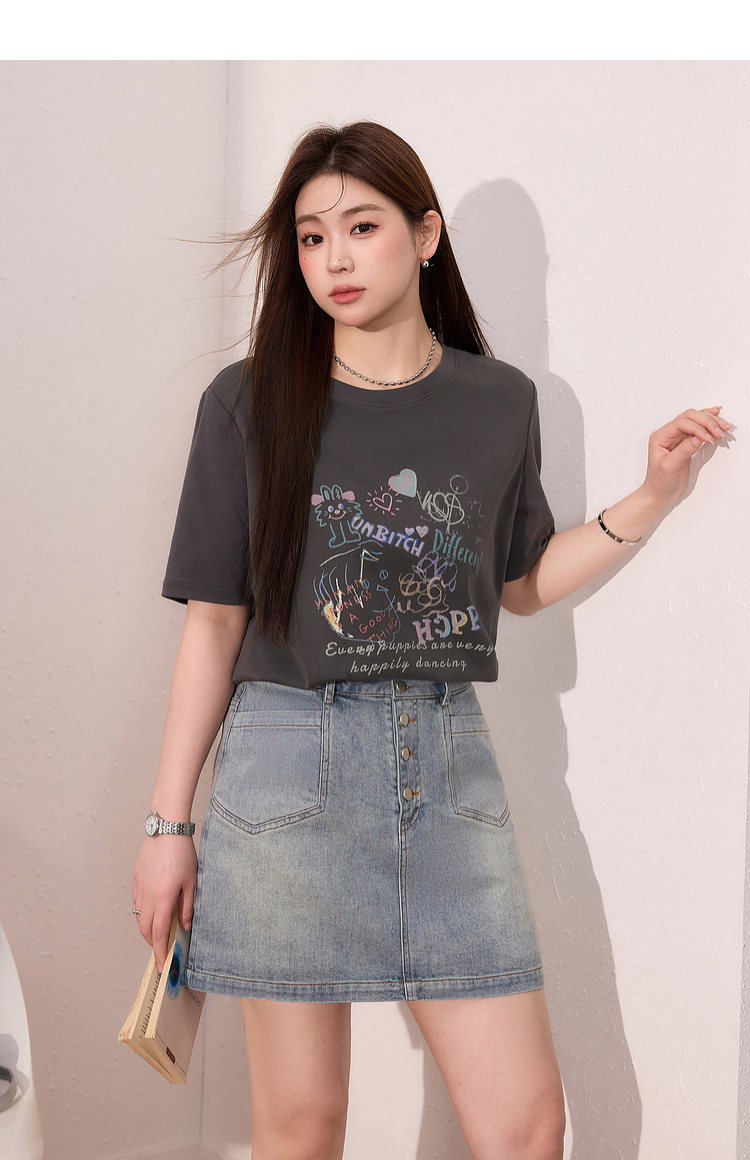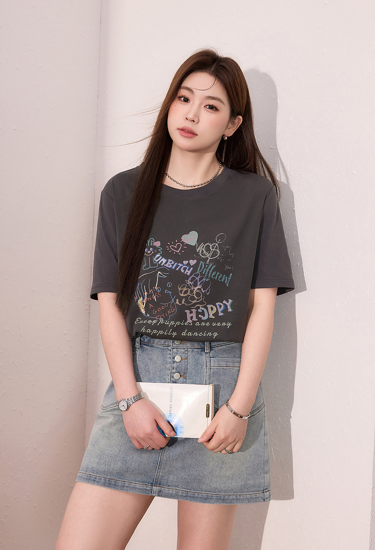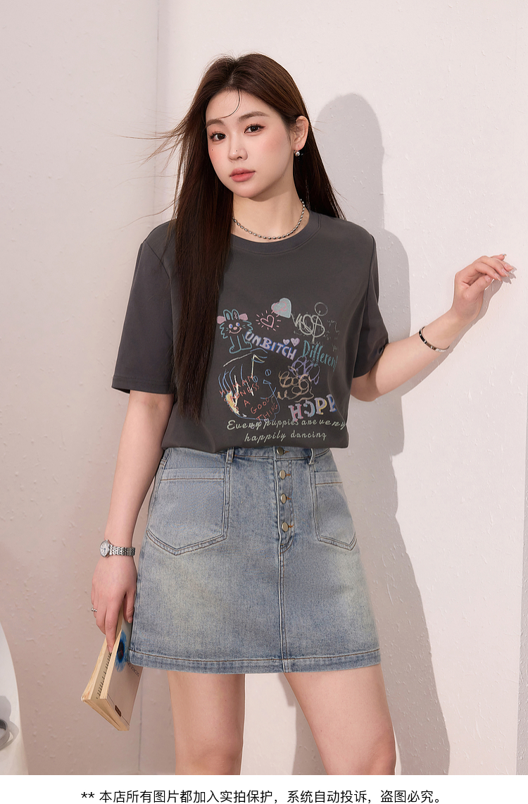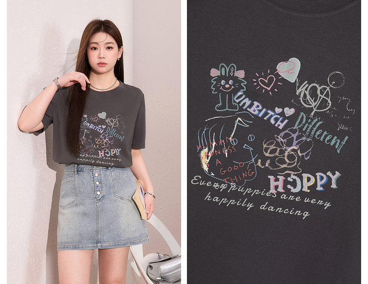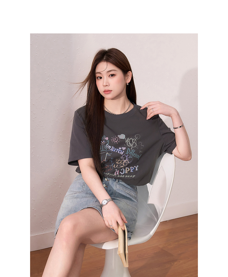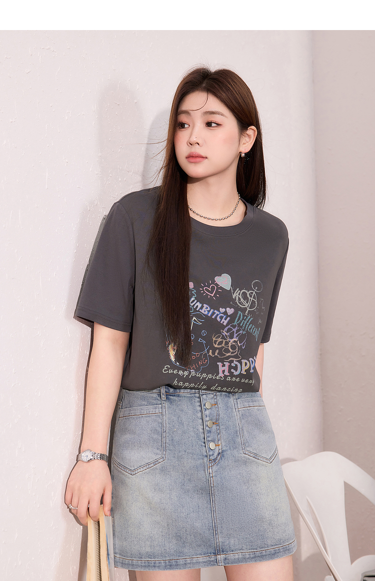 蓝语大码女装时尚涂鸦印花透气短袖T恤夏季宽松显瘦灰色百搭上衣