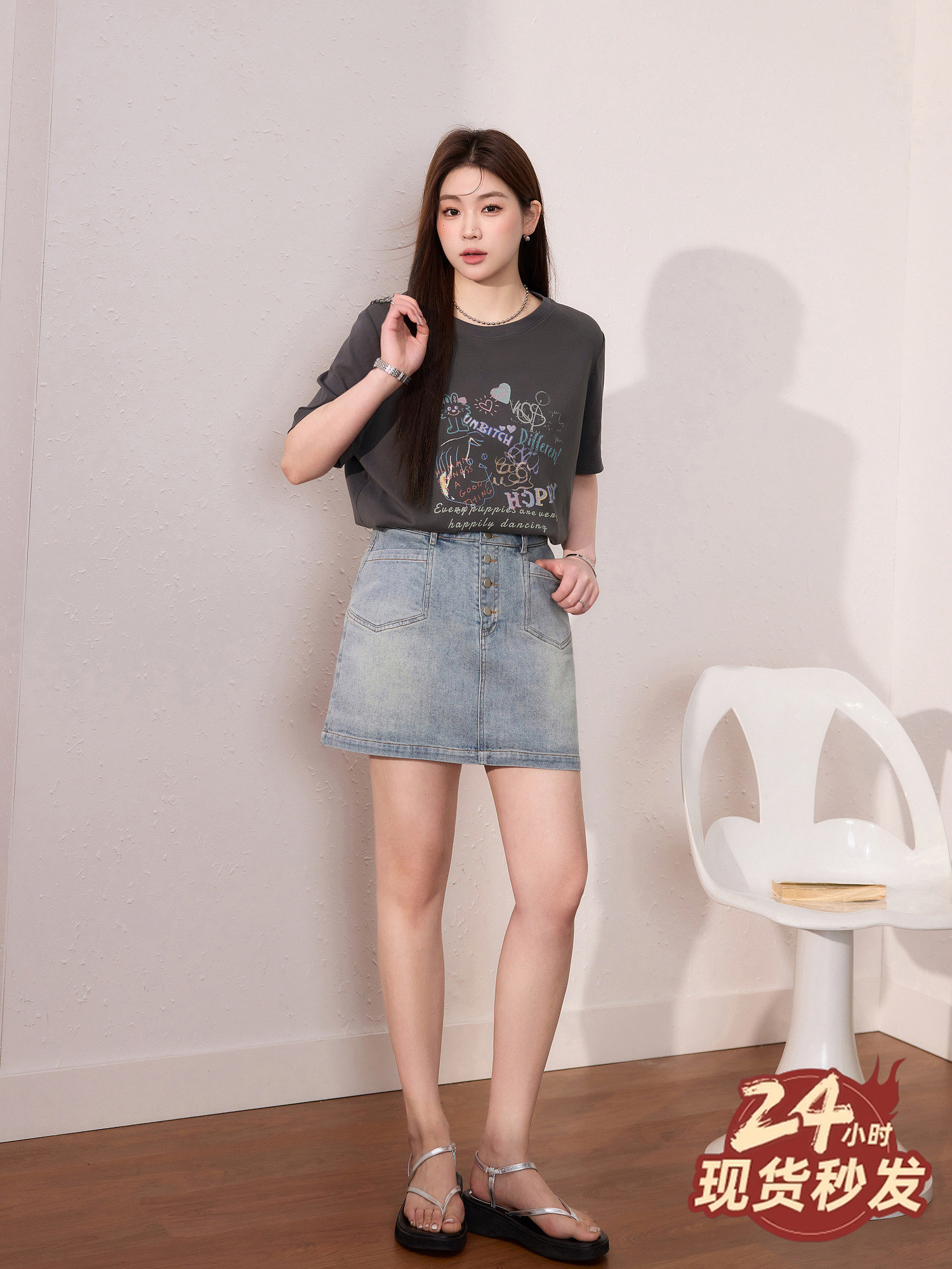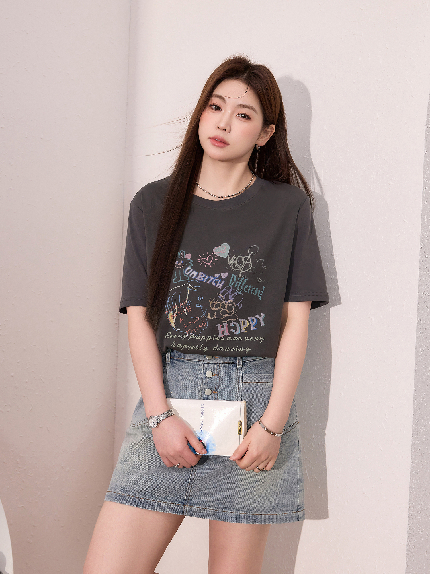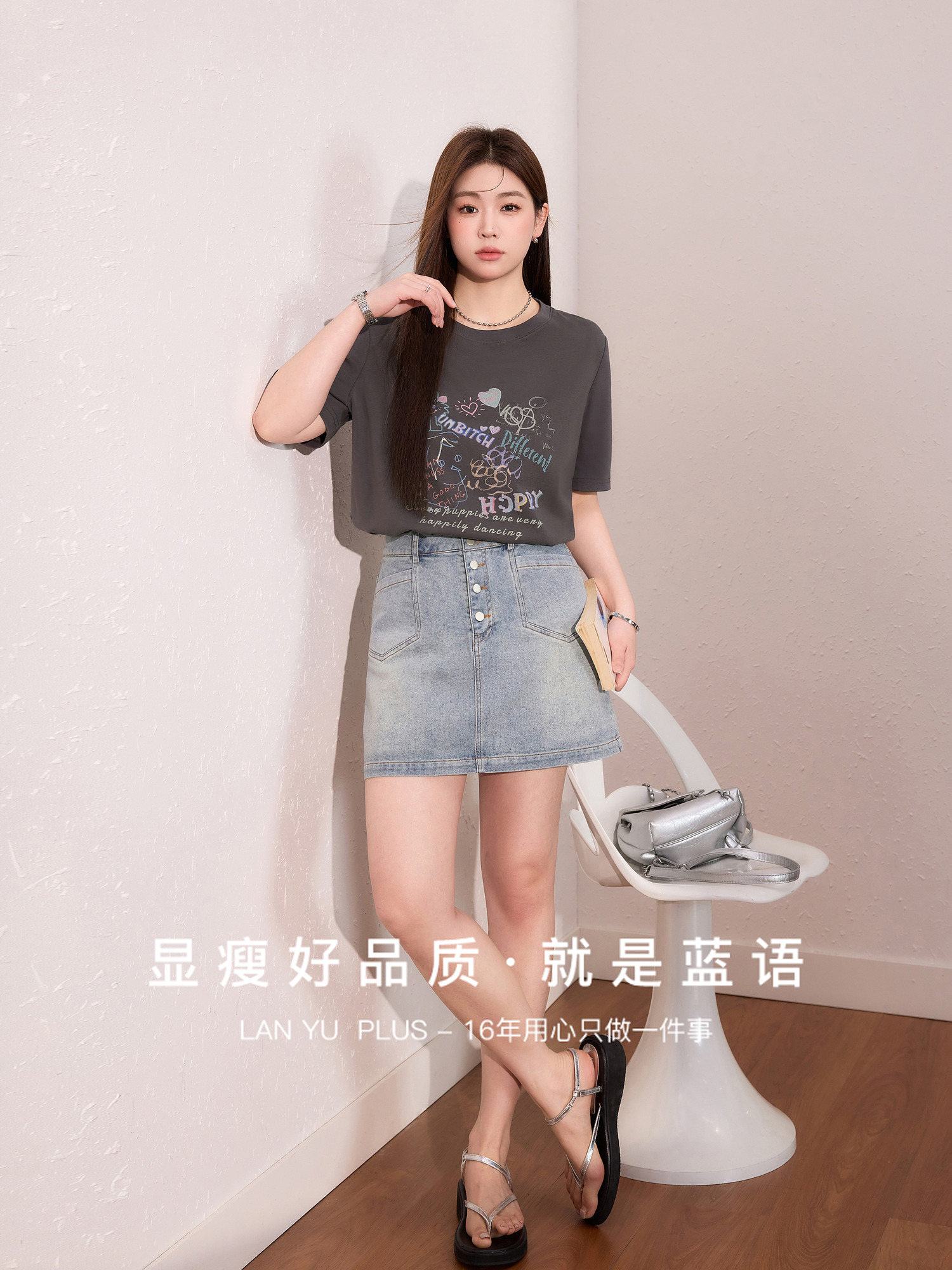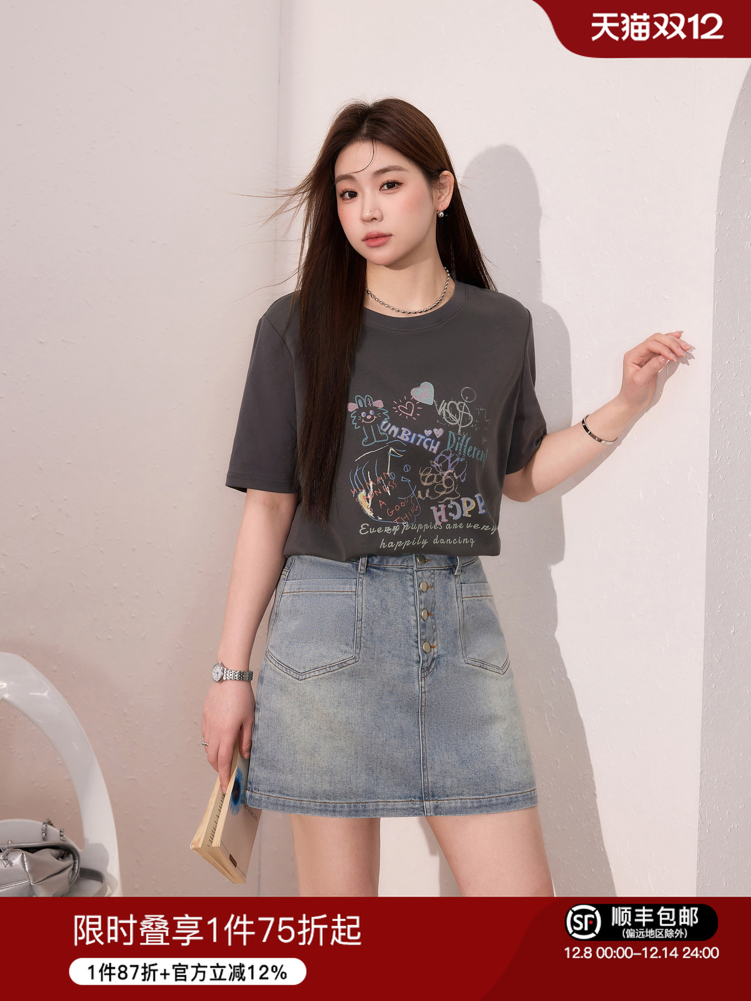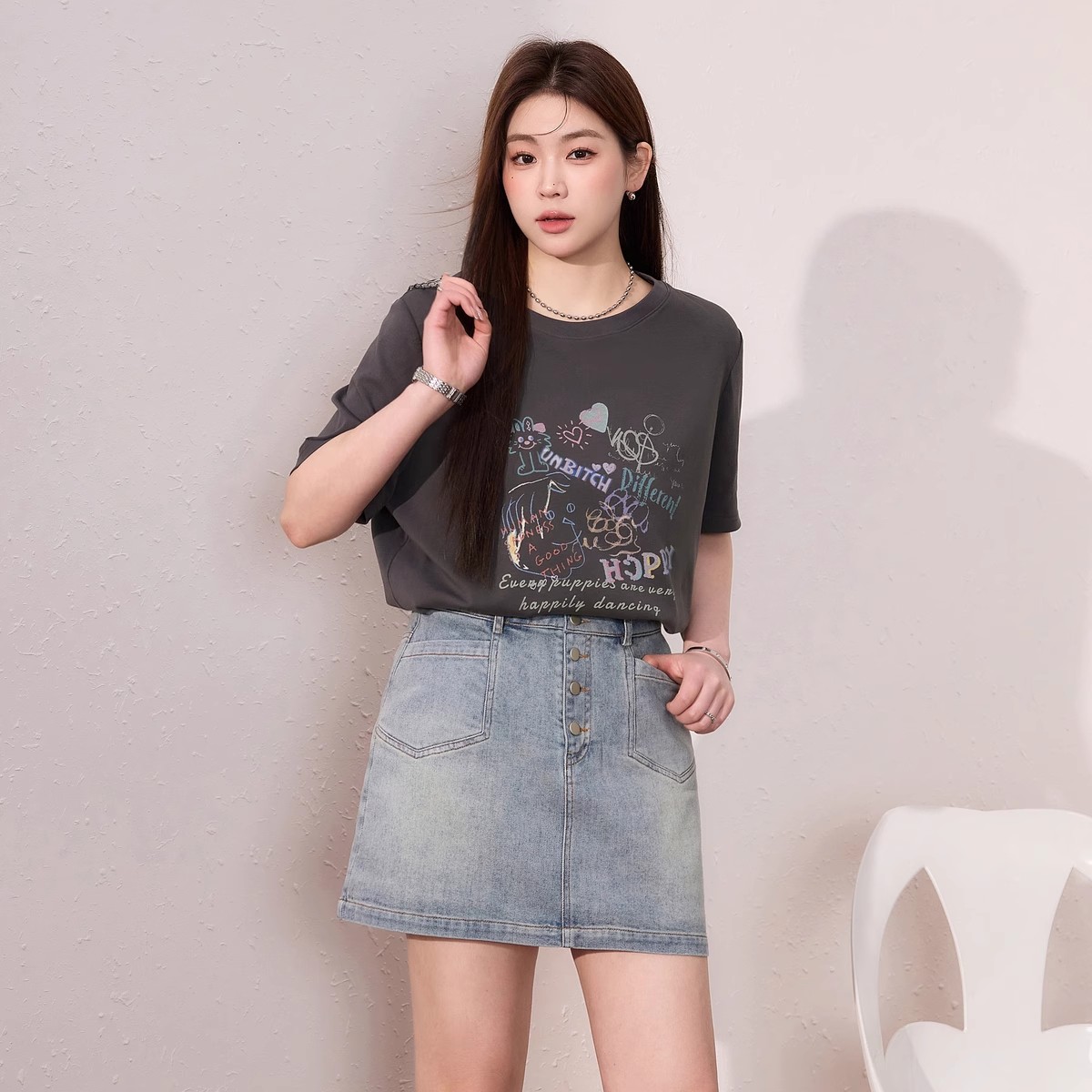 蓝语大码女装时尚涂鸦印花透气短袖T恤夏季宽松显瘦灰色百搭上衣